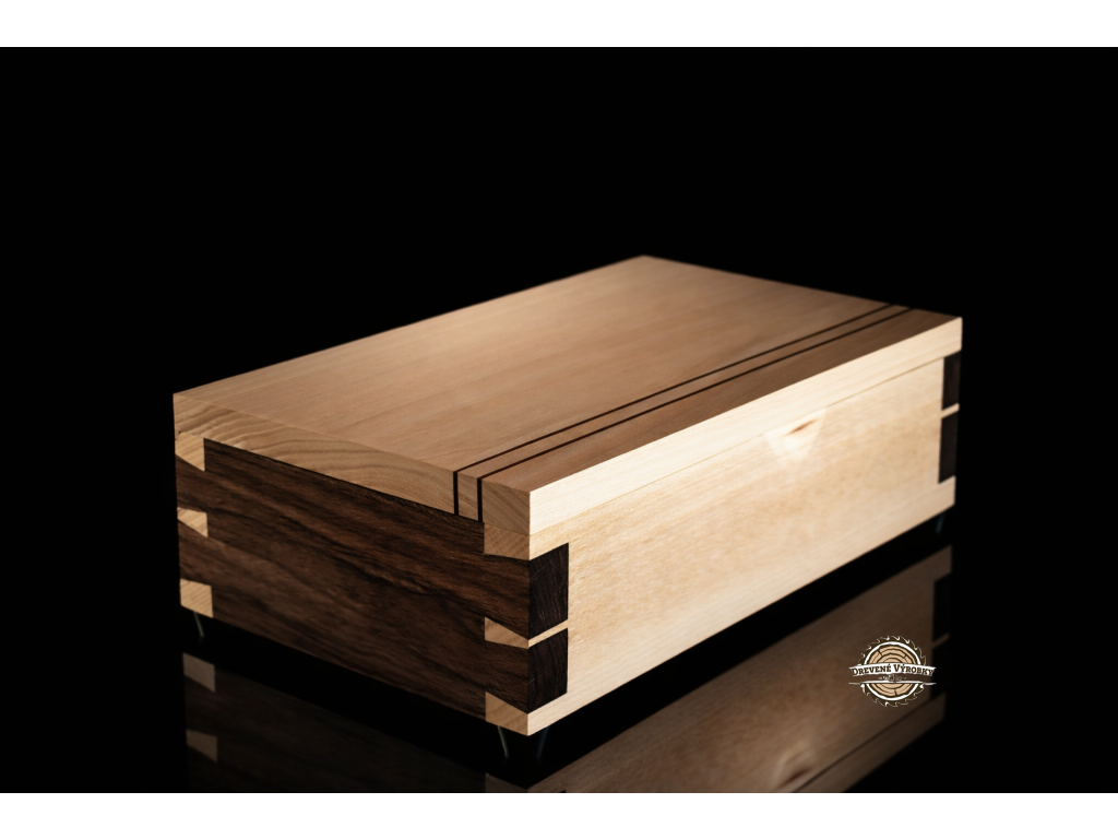 Krabička DUALIS je vyrobená z masívu dvoch kontrastných drevín orech a lipa čapovaním rybinovými spojmi, bez použitia kovových spojovacích prvkov.